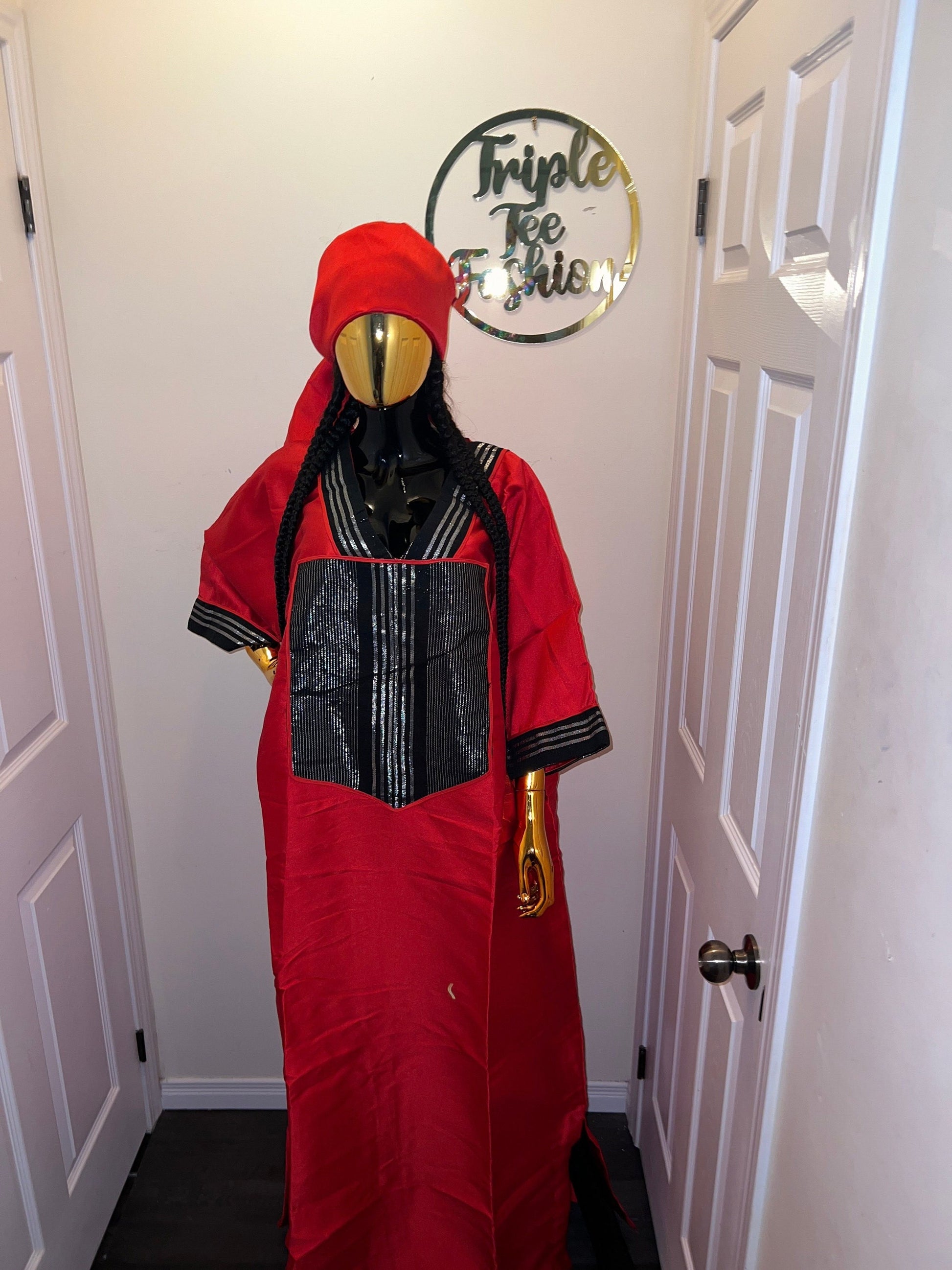 Outfit description - Made from mikado and aso oke. One size fits US size 8 to Size 20, It is a free size boubou. Comes with a cap to match.