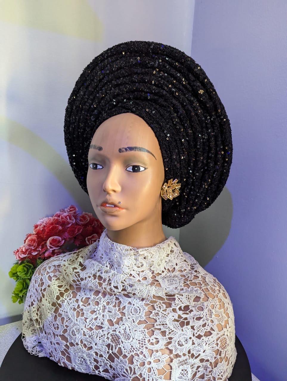 This is luxurious pretied gele is made specifically for you. Just as seen in the photos. Made with sequins fabric.